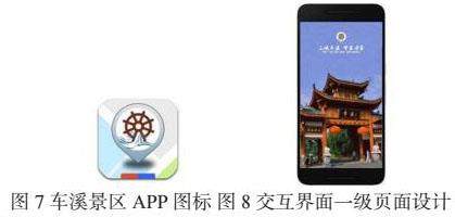 车溪民俗风景区的导视APP视觉设计(图7),以扁平化图标的形象展示,图标主形象以车溪标志性景观——水车为主体图案,色彩以强烈的黑白对比给人传达出一种历史的沉淀感,将车溪风景区的土家民俗通过农耕器具元素符号展现出来,传达了楚人文化的地域性特色。游客在使用的过程之中可深刻感受到强烈的文化符号感与历史沉淀感。