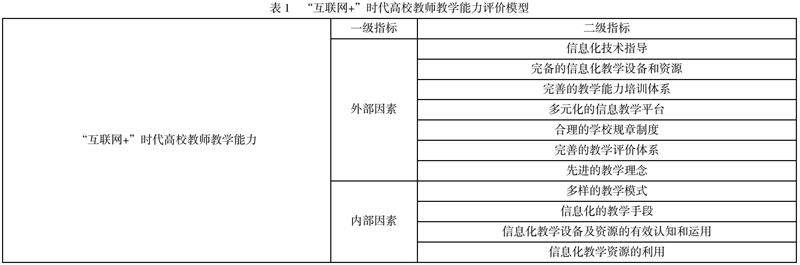通过大量研读相关文献资料和专家访谈,本课题最终筛选并确认以下影响“互联网+”时代高校教师教学能力因素:信息化技术指导、完备的信息化教学设备和资源、完善的教学能力培训体系、合理的学校规章制度、完善的教学评价体系、先进的教学理念、多样的教学模式、信息化的教学手段、信息化教学设备及资源的有效认知和运用、信息化教学资源的利用、多元化的信息教学平台。根据以上影响因素构建“互联网+”时代高校教师教学能力评价模型。如表1所示: