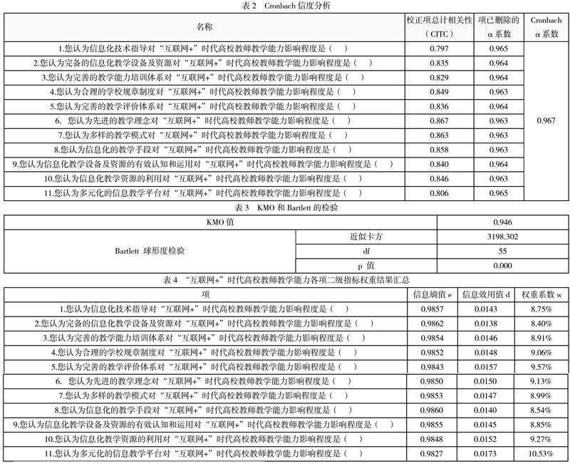 熵值是不确定性的一种度量。信息量越大,不确定性就越小,熵也就越小;信息量越小,不确定性越大,熵也越大。因而利用熵值携带的信息进行权重计算,结合各项指标的变异程度,利用信息熵这个工具,计算出各项指标的权重,为多指标综合评价提供依据。本课题以高校教师为调查对象,问卷调查、实地访谈相结合,获取一手数据和资料,运用熵值法对各项评价指标进行定量分析,深入分析各项评价指标对“互联网+”时代高校教师教学能力的影响程度。受新冠疫情客观环境影响,本次调查问卷主要以网络发放的方式进行,对广东东软学院、广东轻工职业技术学院、广东财经大学、华南师范大学、东莞城市学院等学校进行调研。共回收问卷282份,有效问卷270份,问卷有效率95.74%。运用SPSS软件对量表进行信度分析,信度系数值为0.967,大于0.9,因而说明研究数据信度质量很高;使用KMO和Bartlett检验进行效度验证,可以看出:KMO值为0.946,KMO值大于0.8,研究数据非常适合提取信息。具体数据如表2和表3所示。