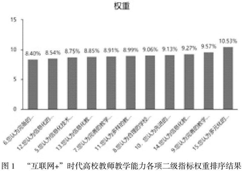 本课题使用熵值法对“互联网+”时代高校教师教学能力十一个二级指标进行计算可以看出:多元化的教学平台、完善的教学评价体系、信息化教学资源利用、先进的教学理念、合理的学校规章制度所占权重较高,说明各高校需要重视这些方面,以便能有效完善和提高“互联网+”时代下的高校教师教学能力。