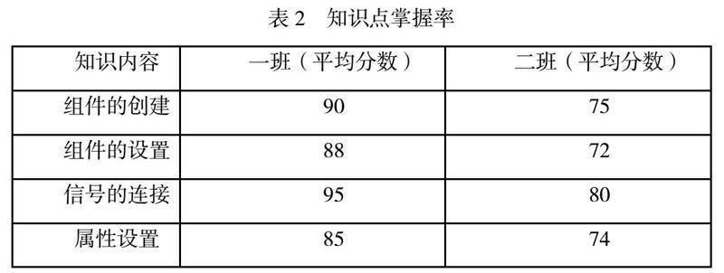 在20级机器人工程的两个班级进行课程中‘Smart组件的应用’教学章节效果对比,其中一班36名同学在上课之前完成了玻璃清洗工作站虚拟仿真实验,其平均成绩为88分,二班作为对比班级没有布置该任务。如表2所示,两个班级在课程后对知识点的掌握情况来看,一班在smart组件的创建、组件的设置、信号的连接,属性设置等难点上掌握情况明显好于二班。基于对学生实践能力培养的效果来看,采用虚拟仿真实验教学更好地实现了课程的培养目标,提升了学生对课程知识点的掌握能力,以及软件的实际应用能力。