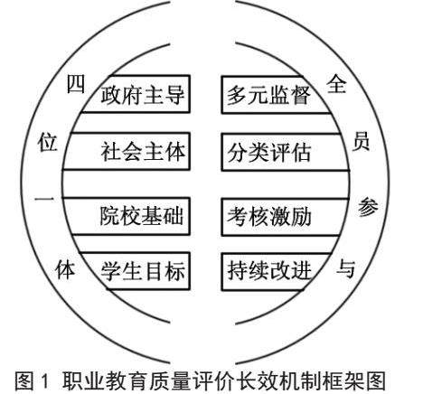 基于“四位一体”的职业教育质量评价长效机制的基本框架与核心内容是:在吸取、运用现代管理学有关理论的合理精髓的基础上,通过组织体系、制度体系的构建以及持之以恒的实践,富有创造性地构建以多元监督、分类评估、考核激励、持续改进为特色的全员参与模式,集“政府为主导”、“社会为主体”、“院校为基础”、“学生为目标” 四种机制于一体的长效机制,如图1。