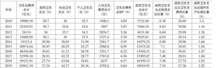 根据表格所示,政府卫生支出在卫生总费用比重基本保持在28%,政府卫生支出占财政支出比重逐年增长,2019年达7.54%,政府卫生支出占GDP的比重在1.82%,总的来说政府在卫生方面的支出相对较低,还有提升空间。