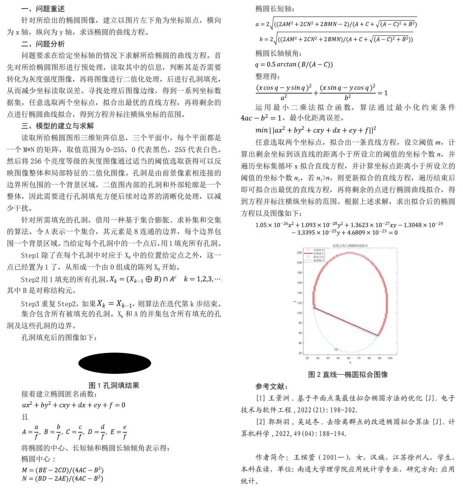 问题要求在给定坐标轴的情况下求解所给椭圆的曲线方程。首先对所给椭圆图形进行预处理,读取其中的信息,判断其是否需要转化为灰度强度图像,再将图像进行二值化处理,后进行孔洞填充,从而减少坐标读取误差。寻找处理后图像边缘,得到一系列坐标数据集,任意选取两个坐标点,拟合出最优的直线方程,再将剩余的点进行椭圆曲线拟合,得到方程并标注横纵坐标的范围。