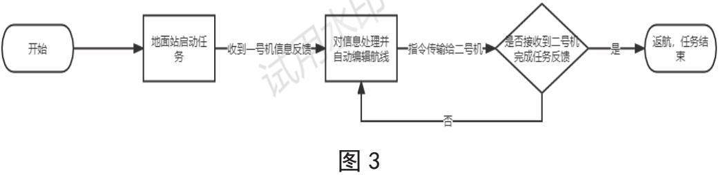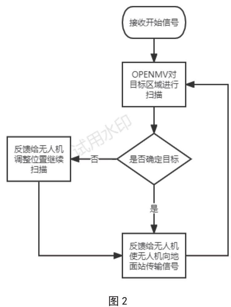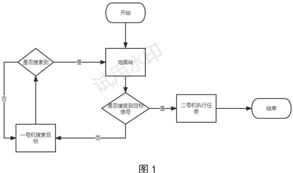 多旋翼无人机其包括:F450机架,pixhawk飞控,OpenMV。执行任务时,巡逻机接收地面站发出的启动信号,并在指定范围内寻找目标,在OpenMV锁定目标后无人机向地面站传输信号并将OpenMV所取得的目标位置与图片信息传回地面站,在原地持续扫描向地面站持续传输目标点位信息,若在区域内未识别到目标点信息,则向地面站进行反馈,由地面站再次编辑航线后继续进行巡逻任务,直到检测到目标位置为止。地面站在接收巡逻机信息后通过自行规划航线,将指令传到作业机,作业机在收到信号后起飞,在指定位置完成任务后对地面站进行反馈,若途中目标点位发生变动,则根据地面站的指令更改目标点位或返航,在地面站接收到作业机信号后地面站命令返航,本次任务完成(如图1所示)。
