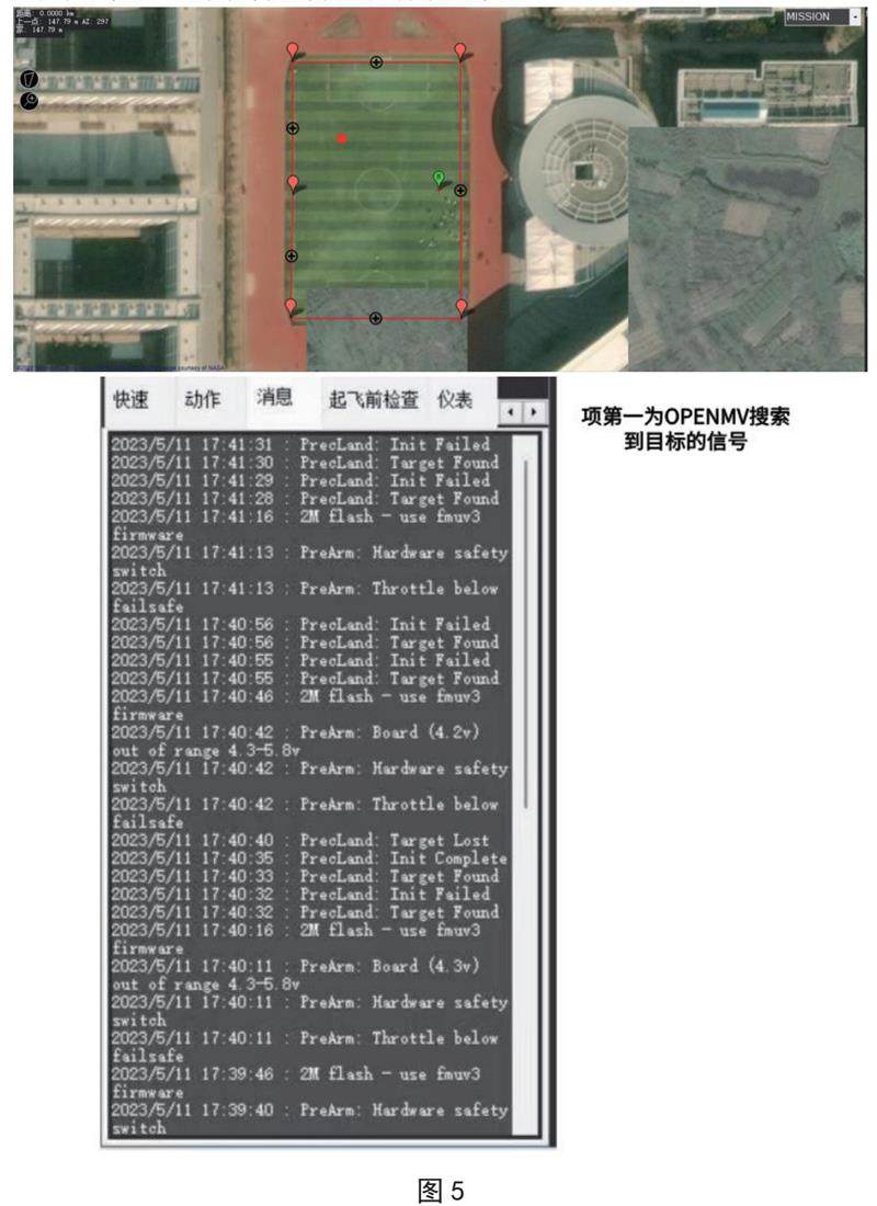调试的对象为图传和OpenMV,两者为本项目进行有效反馈的重要条件。将图传摄像头安装于无人机下方,与FPV屏幕连接,直到可以显示所拍摄的画面为止,图传调试成功。将OpenMV先与电脑上的程序进行连接,得到图像变动时的数据反馈即可与与飞控上已经设置好的team1端口连接,当任务执行时,OpenMV收到地面站所发出的任务开始指令时对区域内没目标进行扫描检测,并对所处位置进行定位,当锁定目标位置时将目标位置与图像所产生的指令通过飞控上连接的WifiSHUCHUAN 反馈给地面站,在此过程中,OpenMV时刻对目标点进行扫描锁定(如图4所示)。