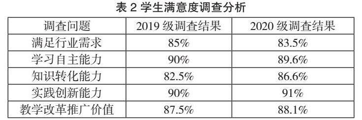 以天津外国语大学数字媒体技术专业2019级40名和2020级67名学生作为研究对象,经过两轮教学,从过程和结果两个方面综合评价教学改革效果。教学效果评价包括是否有助于提高学生的创新能力、动手能力、实践能力、激发学生学习兴趣等,分别对107名学生的学习情况和满意度进行分析。结果表明107名学生都认为通过课程教学改革他们明确了课程学习目标和市场需求,创新实践能力明显提升(如表2所示)。