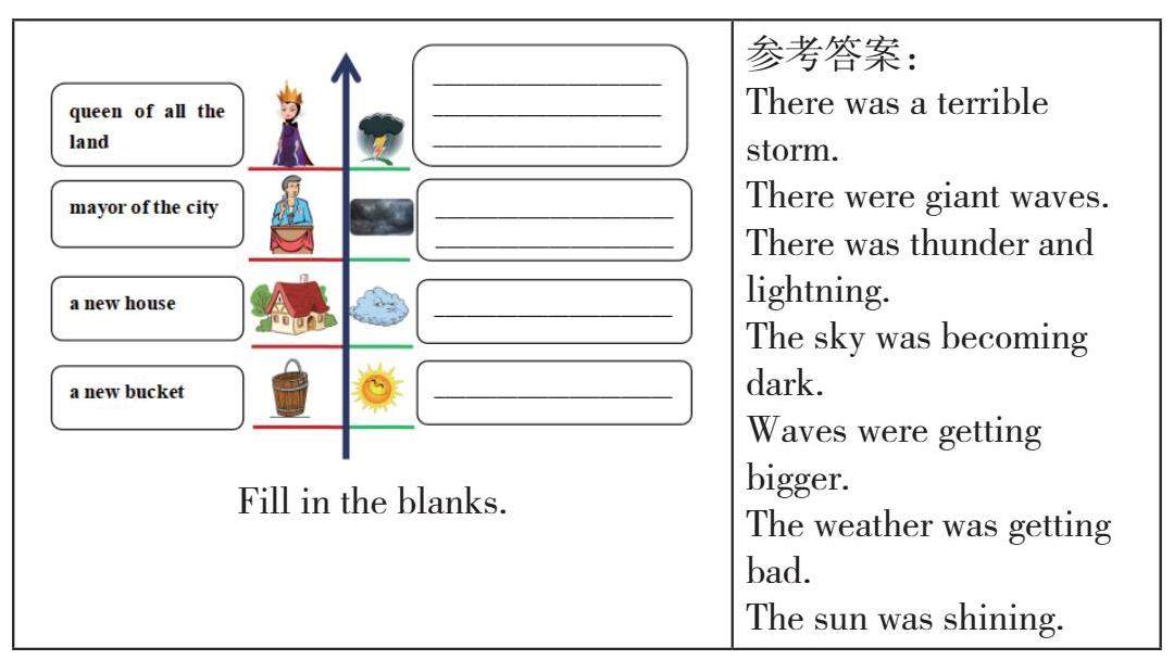 评价与反思:这个教学活动通过让学生寻找天气描写的句子分析人物心情,结合语文学科的写作手法让学生体会环境描写在英文语篇中表达人物心情变化和推动情节发展中的作用。语文学科中自然环境描写对表现人物的身份、地位、性格、表达人物心情、 渲染气氛、推动情节发展都有重要作用。本篇文章当中的环境描写,主要是烘托人物心情和推动情节发展。通过这个读中教学活动,要求学生扫读文本,找出故事中气候变化,通过梳理让学生把握情节发展、气候变化和人物感情变化之间的关联。