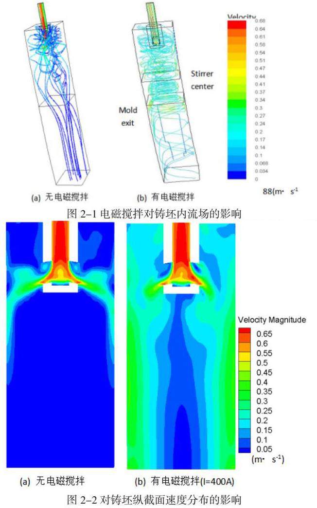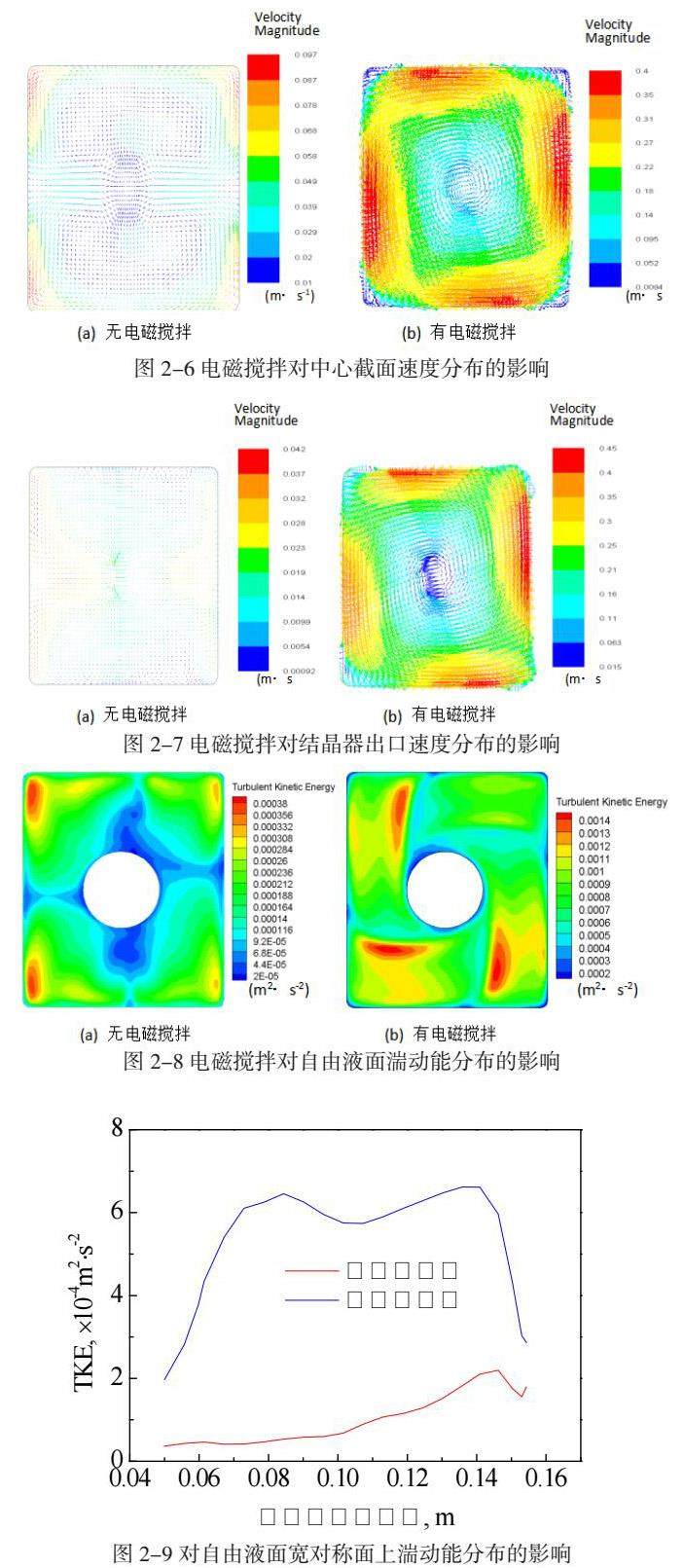 图2-1为采用双侧孔水口时,电磁搅拌对铸坯内流场的影响。可以看到,未采用电磁搅拌时,钢液由浸入式出口流出后,冲击至铸坯窄面,而后分别流向自由液面与结晶器出口,钢液在到达结晶器出口之前,流动方向已经基本与拉坯方向一致。与之对比,采用电磁搅拌会使钢液在流出水口之后,转变为速度较高的水平旋转。同时,因在结晶器内受到的电磁力较大,在结晶器内的旋转速度较快,钢液出结晶器之后,旋转速度迅速下降。