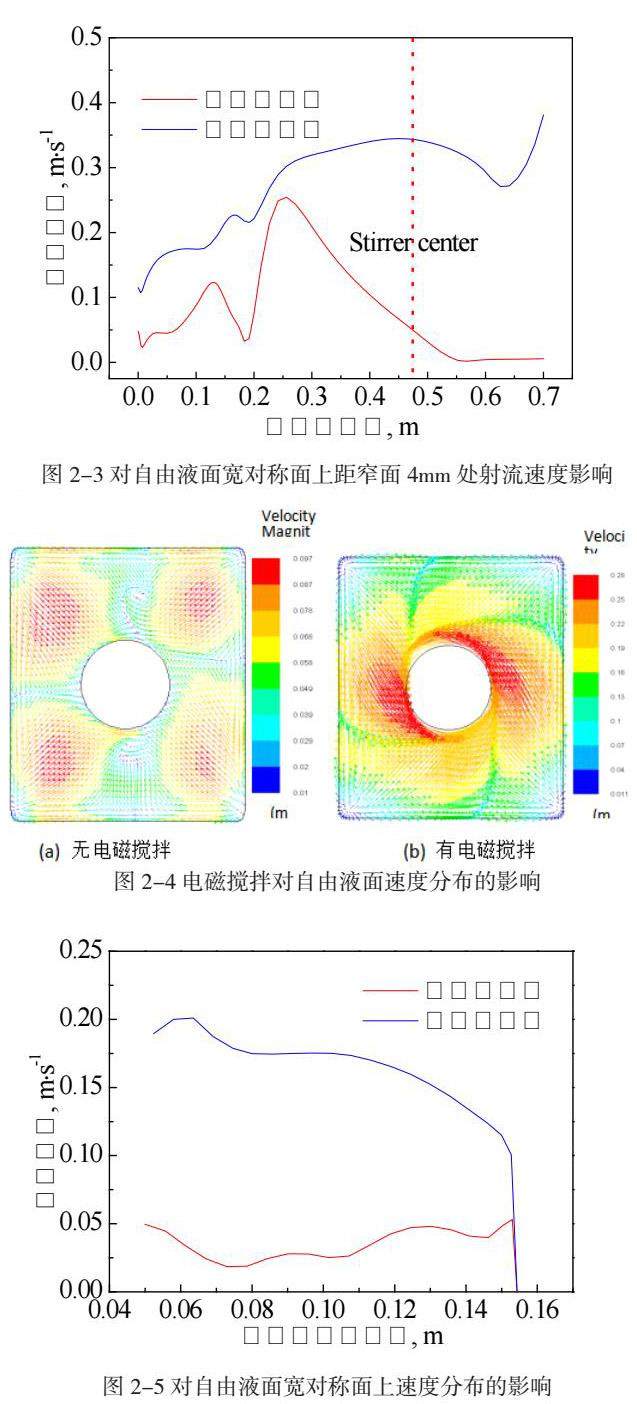 图2-4、图2-5与图2-6分别为自由液面、搅拌器中心截面与结晶器出口处速度分布。图2-7为电磁搅拌对自由液面宽对称面上速度分布的影响。有图中可以看到,采用电磁搅拌使自由液面上钢液流动方向转变为旋转方向并增大了液面流速,峰值位置也转移至水口附近。并且自由液面的流速由0.097m·s-1增加至0.28m·s-1。同时,在搅拌器中心截面与结晶器出口处本已缓慢流动的钢液也因电磁力的影响而快速旋转,最大流速分别由0.097 m·s-1与0.042 m·s-1提高至0.4 m·s-1与0.45 m·s-1。