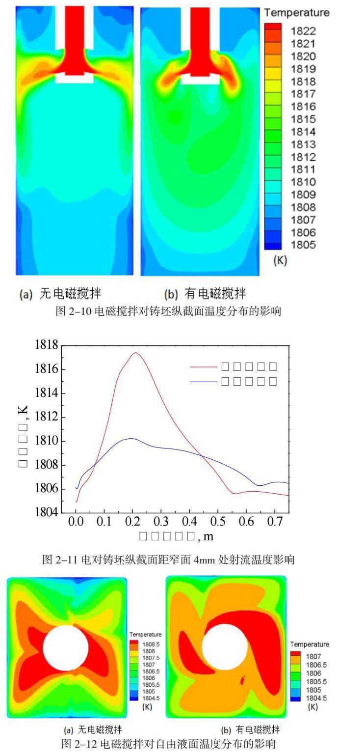 为电磁搅拌对结晶器自由液面温度的影响。电磁搅拌的采用虽将自由液面上的峰值温度由1808.5K降低至1807K,但却提高了窄面附近的低温区温度,改善了自由液面上的温度均匀性。高温区形状也由“长蝴蝶”形转变为风车形。
