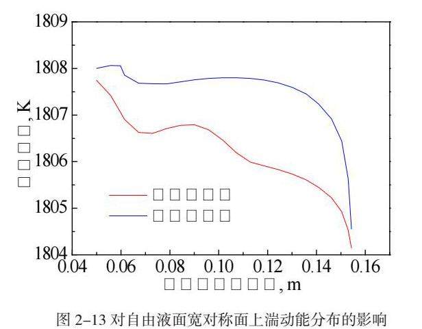 图2-8与图2-9为电磁搅拌对自由液面上湍动能分布的影响。由图中可以看出,自由液面上的湍动能由无电磁力时的0.00038m2·s-2提高至有电磁搅拌时的0.0014 m2·s-2。并且水口附近的低湍动能区也因峰值位置向水口附近转移而快速缩小,为改善渣面活跃度提供了动力。