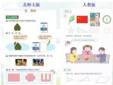 我们来比较和分析一下人教版和北师大版关于《周长》这课的内容。总体上看编排是差不多,先从实物和图形揭示周长的概念,再通过各种操作活动来测量周长,从而巩固对周长概念的理解。