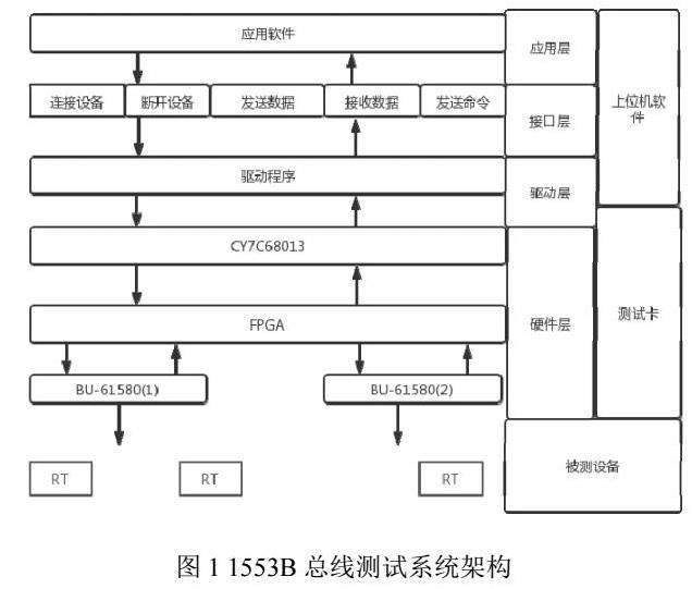 本次设计的1553B总线测试系统旨在满足1553B总线测试的复杂性和实时性要求,使用户能够根据测试需求快速搭建系统。系统架构包括上位机软件、1553B总线测试卡和被测1553B总线设备。上位机软件分为驱动层、接口层和应用层,负责系统与用户的交互。硬件层包括USB接口单片机CY7C68013、主控FPGA(XC3S400)以及两片BU-61580。驱动层的驱动程序与USB接口单片机的固件程序协作,实现上位机与测试卡之间的命令和数据传递。接口层封装了与测试卡的通信接口,应用层则负责测试流程和逻辑的实现。主控FPGA响应应用软件的控制命令,初始化配置BU-61580,发起总线数据传输,监控总线数据,并模拟RT响应BC,将监控数据和各种数据请求上传至上位机。用户根据测试需求配置BU-61580,通过应用软件发送命令和测试数据至主控FPGA,完成测试流程。这个系统通过数据环路实现了1553B总线测试,提供了灵活、可定制的解决方案,以满足不断增长的测试需求[1]。详情如图1所示。