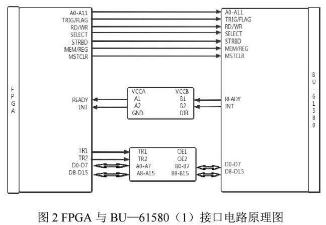 FPGA与BU-61580(1)接口设计是为了实现1553B总线测试系统中BC(Bus Controller)与FPGA之间的通信和数据传输。BC负责模拟总线控制,而FPGA需要与BC协同工作以完成数据交换和控制命令的传递。在设计中,考虑到FPGA的电平接口为3.3V,而BU-61580(1)的电平接口为5.3V,因此采用了3.3V和5V之间的电平转换。为了实现数据总线通信,使用了SN74ALVC164245-EP芯片,这是一个16位的3.3V至5V电平转换收发芯片。将FPGA的A端与SN74ALVC164245-EP的A端连接,将BU-61580(1)的数据总线与SN74ALVC164245-EP的B端连接,从而实现数据的双向传输。控制方向通过FPGA来实现,通过控制OE1、OE2、TR1和TR2信号的状态,可以控制数据是由A到B还是由B到A传输。此外,BU-61580(1)有17个寄存器和4K×16位的存储空间,所以需要12位地址总线(A0~A11)和16位数据总线(A0~A15)来进行通信。地址总线和控制信号的方向是单向的,无需进行电平转换,而数据总线是双向的,需要进行电平转换。为了反馈信息给FPGA,需要将READY信号和INT信号传递回FPGA。这些信号需要经过电平转换,使用了SN74LVC2T45等类似的电平转换芯片。此外,方向控制DTROE1和DTROE2由BU-61580控制,从B到A的方向。详情如图2所示。