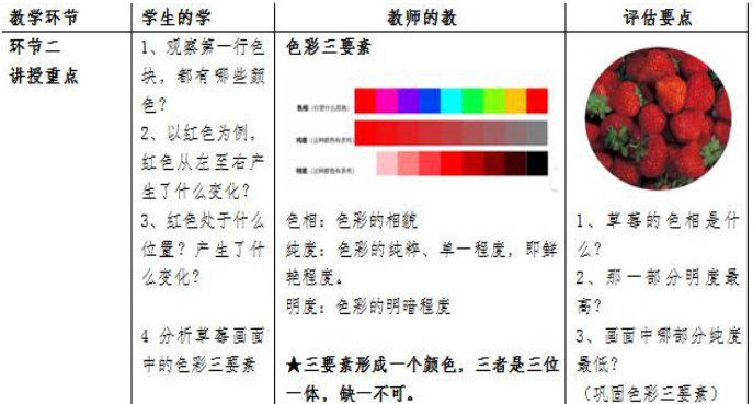 四个方面这一块是教学设计的亮点,依据学教评一致性设计理念,每一个学习目标都有相应的评估任务,每个评估任务都有相对应的教学活动、具体环节去落实。以讲授重点这一环节为例,1、明确课标任务 2、教师教什么,3、学生分步骤学习。4、教师通过图片的特点向学生提问色彩三要素的相关知识点,根据学生的回答来评估这一环节学生的掌握情况。坚持“三围绕”原则,围绕课标定学习目标,围绕学习目标定教学活动,围绕教学活动定评估任务,将学教评深入的融入到每一个教学环节中,更有目的性、检验性的去完成教学任务。