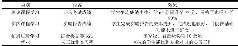 实施创新培养模式后,实践成效显著。在理论课程学习方面,学生期末考试成绩的平均分由往年的65 分提升至72 分,及格率也达到了 80% 。在实践课程中,学生的实验报告完成效率和完成质量均有提升,并展现出在基础功能上进行扩展的能力。拓展进阶学习成果丰硕,学生在各类综合竞赛中获得国家级、省部级奖项10 余项。就业方面成效突出,大三学生的专业对口实习率达到了 70% 。这些数据综合表明,该创新模式有效促进了学生理论知识、实践能力与职业竞争力的全面提升。如表1 所示