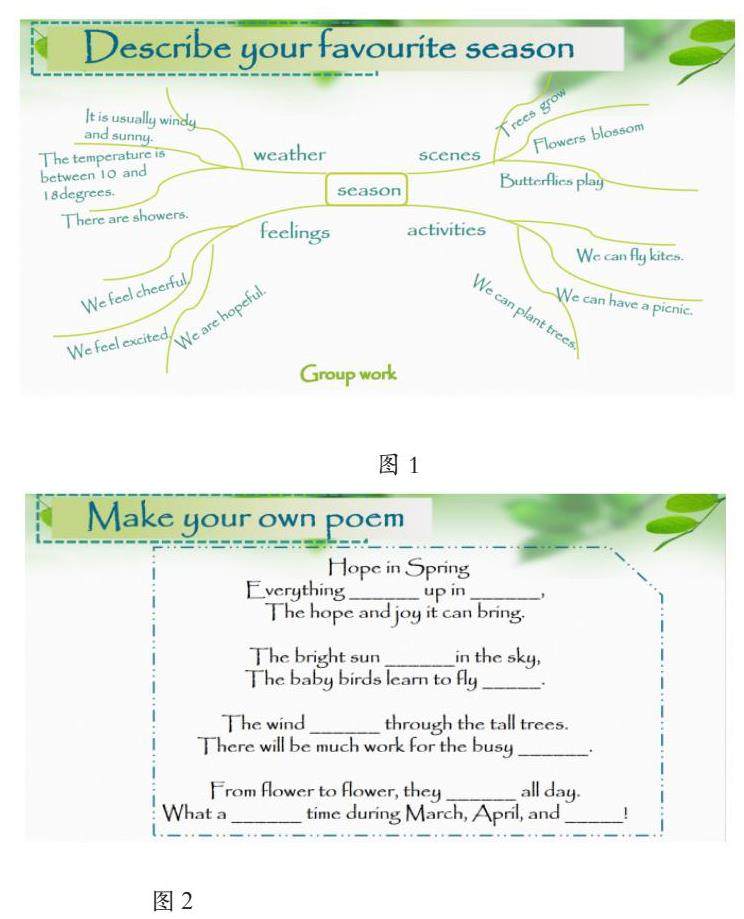 在阐述的过程中,教师引导学生不断生成出这样一首小诗:Trees start to grow, wind begins to blow, butterflies play among flowers, bees hide from the showers.在阐述"feelings"的过程中,让学生充分探讨,最终用"cheerful, joyful, hopeful"来对人们对"spring"的感受进行总结。