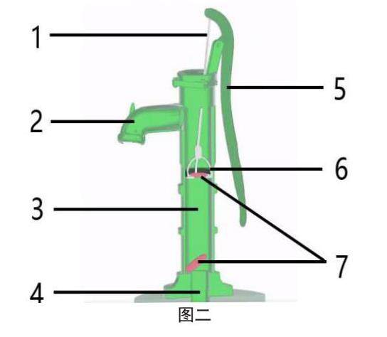 手压泵的结构示意图如图二。其主要结构有1、活塞杆2、出水口3、水泵支柱4、水管,用于连接地底深处5、手压杆6、往复式活塞7、止回阀。