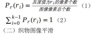 直方图在对图片曝光精确度进行反映的时候,多以图形化参数实现,其描述的是针织面料图片限时范围内影像的灰度分布曲线。在直方图的左侧位置,可以将针织面料图像的阴影信息展现出来,在中间位置可以将中间色调信息显示出来,在右侧位置可以将图像的高亮信息显示出来。用r表示横坐标灰度值,那么灰度值出现的概率如下: