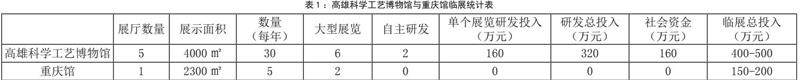 摘要:提高科普展览水平是当前我国科技馆面临一个重要课题,实现展览的自主研发是提高展览水平的必经之路。展览的自主研发需具备诸多条件,如资金投入、组建研发团队、学习先进展览研发经验等。台湾地区科技馆发展较早,科普展览研发整体实力较强。本文通过对比重庆科技馆(以下简称重庆馆)与高雄科学工艺博物馆(以下简称高雄馆)在临时展览的举办、自主研发、团队建设等现状,研究两馆对于临展整体定位及各方面投入的差异,分析内地科技馆在临展研发上存在的不足,并结合实际,提出科技馆实现科普展览自主研发的对策和建议。