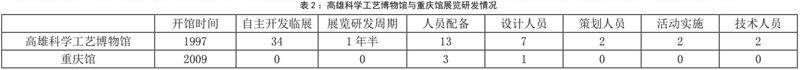 重庆馆(以下简称重庆馆)是重庆市十大社会文化事业基础设施重点工程之一,是面向公众的现代化、综合性、多功能的大型科普教育场馆。肩负全市公共文化产品供给和科学文化传播、促进全民科普、提高全民科学文化素质等社会公益职能②。高雄科学工艺博物馆(以下简称科工馆)是台湾第一座应用科学博物馆,也是台湾南部第一个公立科普教育机构,以收藏及研究科技文物、展示与科技相关主题、推动科技教育与提供民众休闲和学习其主要功能③。与重庆馆相比,科工馆建馆较早,研发了“纳米材料”“发明——怎么一回事”“森林与我”等多个优秀展览。笔者对两馆临展及展览研发情况做了深入的分析对比。
