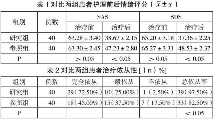 经数据统计,护理后,SAS、SDS评分研究组低于参照组,治疗依从率研究组高于参照组(P<0.05);研究组优势性凸显。
