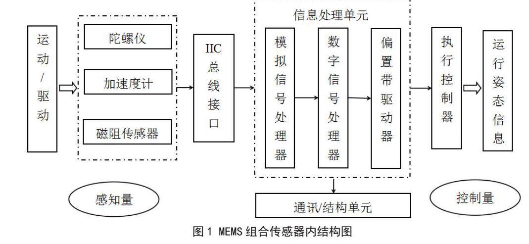 MEMS组合传感器是由三轴加速度、三轴陀螺仪、磁传感器组合而成,实现全方位、立体运动的监测模式。选择3轴陀螺仪和3轴加速度传感器形成三维测量传感器,同时选取高分辨率磁阻传感器获取磁北方向数据,通过三种微型传感器结合外围电路,实现数据的同时间点的统一链路获取实时采集。在电路设计和各芯片数据获取时统一采用IIC接口方式。组合传感器在收到外力的运动或驱动时,三个微型传感器感知到数据的变化,均通过IIC总线接口同时获取到各芯片的原始数据,经过信息处理单元将数据通过模拟信号处理器、数字信号处理器和偏置带驱动器,再经过执行控制器将数据进行融合计算输出运行姿态信息。MEMS组合传感器内结构如下图2-1: