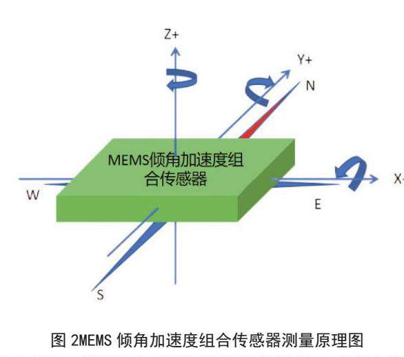 MEMS倾角加速度组合传感器中的倾角加速度传感器可测量三轴方向任意方向的变化量,和加上磁阻传感器测量磁场在绕Z轴旋转过程所产生的磁北角。