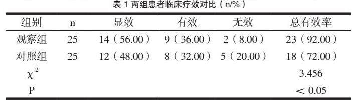 治疗后,观察组疗效更显著,与对照组相比,差异有统计学意义(P<0.05);见表1: