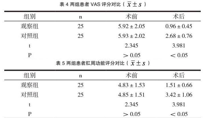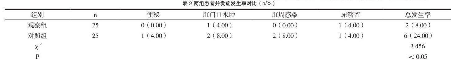 以本院2021年09月~2022年09月收治的50例痔疮患者,通过随机数表法均分为两组,观察组(n=25):男性和女性为13例和12例,最小年龄22岁,最大年龄50(37.23±3.45)岁。对照组25例患者:包括15例男患者和10例女患者;年龄区间为24~52(38.92±2.89)岁。纳入标准:①确诊痔疮的患者;②有完整的资料信息;③意识清楚,智力正常者;④能够积极配合本试验者。排除标准:①中途退出者;②将有精神系统疾病者剔除;③有凝血功能障碍者;④有手术禁忌症。上述研究人员的有关资料相比较,差异无统计学意义(P>0.05)。本课题取得了患者家属的理解和支持。