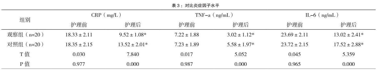 观察组护理后的各项炎症因子水平均低于对照组(P<0.05)。如表3所示: