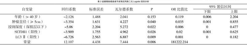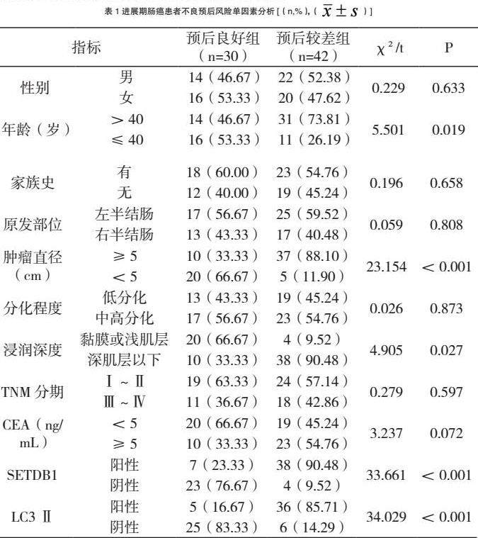 以预后情况作为因变量(良好=0、较差=1),将两组患者基本资料作为自变量进行单因素分析。结果显示,年龄、肿瘤直径、浸润深度、SETDB1和LC3Ⅱ是进展期肠癌患者不良预后风险影响因素。见表1。