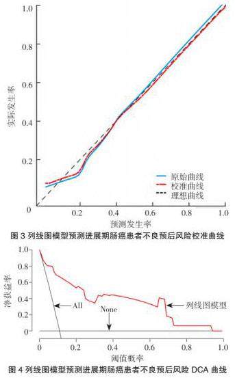 进展期肠癌患者不良预后风险列线图如图1所示。该列线图模型预测进展期肠癌患者不良预后风险曲线下面积为0.921,如图2所示。校验曲线分析结果显示,进展期肠癌患者不良预后风险列线图校验曲线与理想曲线近似,如图3所示。决策曲线分析结果显示,该列线图模型预测进展期肠癌患者不良预后风险概率阈值为0.16~0.98时,患者净获益率>0,如图4所示。