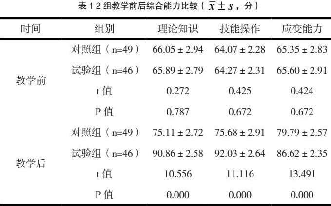 2.1 综合能力 教学后,2组理论知识、技能操作及应变能力得分均明显提高,且试验组高于对照组(P<0.05)。见表1。
