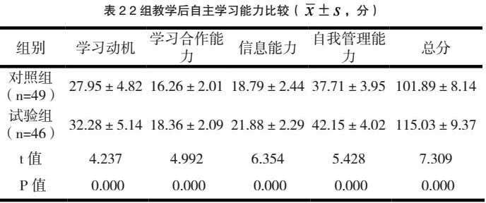 2.2 自主学习能力 试验组自主学习能力各项得分均高于对照组(P<0.05)。见表2。