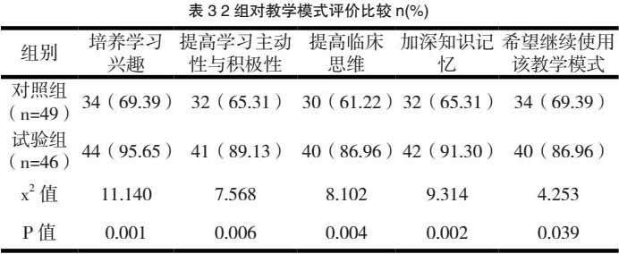 2.3 教学模式评价 试验组对教学模式各项评价均优于对照组(P<0.05)。见表3。