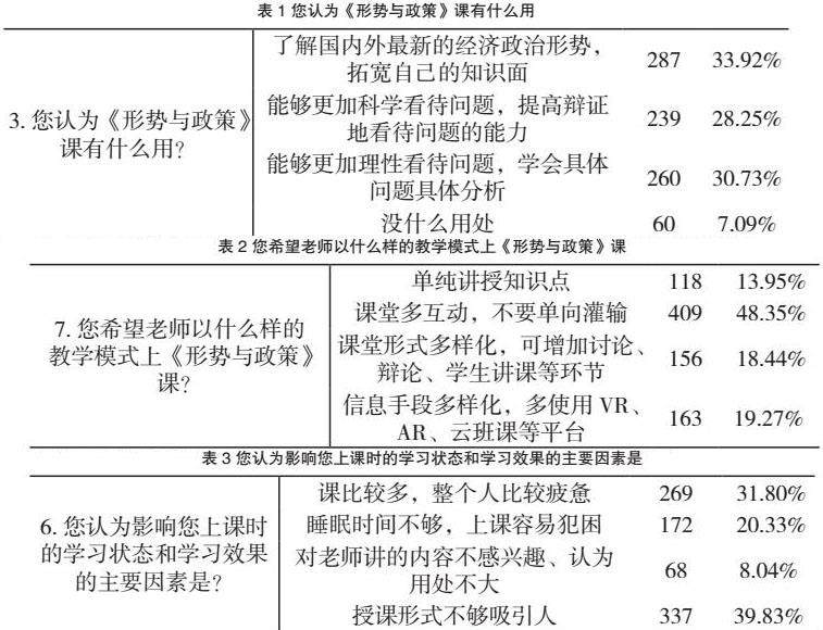在“3.您认为《形势与政策》课有什么用?”问题中,30.73%受访学生表示“能够更加理性看待问题,学会具体问题具体分析”、7.09%表示“没什么用处”。具体如表1。