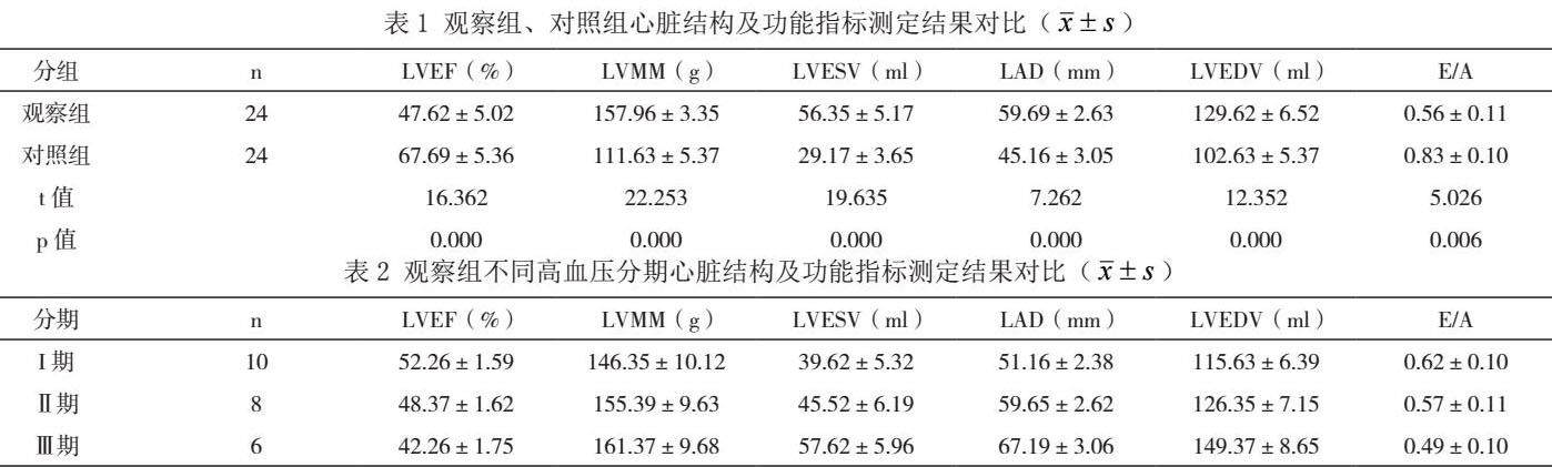 观察组中高血压分期I期10例,Ⅱ期8例,Ⅲ期6例;高血压Ⅲ期患者的LVEF、E/A低于I期、Ⅱ期患者,而LVMM、LVESV、LAD、LVEDV均高于I期、Ⅱ期患者P<0.05。