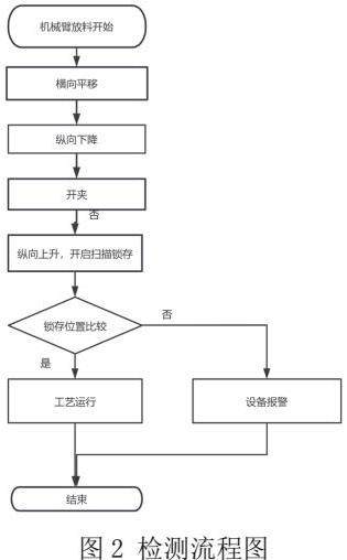 正常机械臂夹取晶圆盒动作流程为:横向平移→纵向下降→合夹→纵向上升。晶圆检测指令在机械臂纵向下降过程中开启坐标锁存功能,等待对射光纤传感器的信号变化,信号变化时锁存晶圆盒位置数据,根据采集的晶圆盒高度位置数据,判断当前晶圆盒是否正确放入指定限位位置,为设备的下一步动作提供参考数据。图2检测流程图
