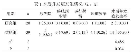 2023年1月--2024年12月,选取我院收治的59例中小体积BPH患者,按照随机数字表法分为两组。纳入标准:BPH者;正常交流者;签署知情同意书,自愿参与;排除标准:颅脑责任病灶者;精神疾病者;不符合手术指征者;合并其他恶性肿瘤者。研究组(20例)年龄51~76岁(64.65±4.17)岁,病程1~7年(4.15±1.07)年;对照组(39例)年龄52~78岁(64.33±4.36)岁,病程2~8年(4.43±1.26)年。两组一般资料差异无统计学意义,P>0.05,具有可比性。
