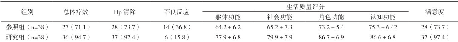 分析观察两组患者在临床疗效、幽门螺杆菌 (Hp) 清除率、不良反应发生率、生活质量评分、满意度方面的差异表现。显效:患者的食欲减退、腹痛、腹胀和嗳气等症状有所减轻或完全消失;有效:患者的食欲减退、腹痛、腹胀和嗳气等症状仅有轻微好转;无效:患者的临床症状没有改善甚至恶化。
