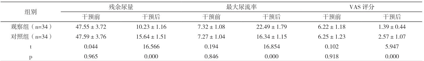 表1 示:控尿功能、疼痛情况评估结果显示,观察组患者干预后的残余尿量VAS 评分偏低、最大尿流率偏高,统计学结果呈 P<0.05⨀ 。