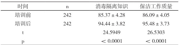 经培训后,全体保洁人员评分均明显优于培训前,且差异具有统计学意义(