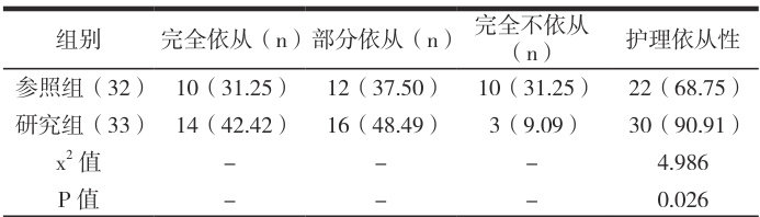 两组护理后,研究组患者的护理依从性高于参照组患者(P<0.05 ),差异具有统计学意义;见表1 :