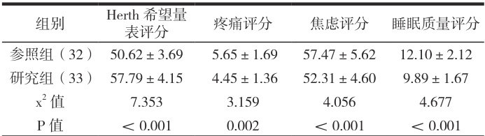两组护理后,研究组患者的Herth希望量表评分高于参照组患者(P<0.05 ),而研究组的疼痛评分、焦虑评分、睡眠质量评分低于参照组( P<0.05 ),差异具有统计学意义;见表2 :