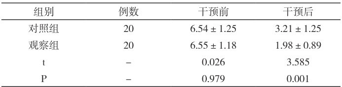 如表 1,干预前疼痛评分对比无统计学意义( P>0.05 ),干预后,观察组的评分低于对照组( P<0.05 )。