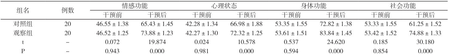 如表 2,干预前生活质量指标评分对比无统计学意义( P>0.05 ),干预后,观察组的评分高于对照组( P<0.05 )。