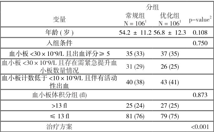 1 患者临床特征:本研究最终有 206 例患者符合试验入排标准,其中常规组 106 例,优化组 106 例。常规组患者的平均年龄为 54.2 岁,优化组患者的平均年龄为 56.8 岁。入组时疾病状态:血小板计数低于 <10×10-9/L 且伴有活动性出血的患者有 83 例,血小板<30×10-9/L 且出血评分 ⩾5 的患者有 72 例,血小板 <30×10-9/L 且存在需紧急提升血小板数量情况的患者有 57 例。按照血小板体积进行分组后,平均血小板体积 >13 fl 的患者在常规组和优化组分别为 25 和 27 例,平均血小板体积 ⩽ 13 fl 的患者在常规组和优化组分别为81 和79 例,两组患者的临床特征差异无统计学意义(Table 1)。但是在分析常规组和优化组之间的治疗方案相关病例数时,发现两组之间存在统计学差异, p<0.001 (Table 1)。