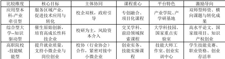 本研究通过构建“目标-结构-路径”分析框架,对应用型本科、综合型大学与高职院校三类高校的双创教育生态系统进行比较研究,识别出三种差异化生态模式:应用型本科的“产业牵引型”、综合型大学的“知识驱动型”以及高职院校的“技能赋能型”。研究表明,这三种模式在核心目标、主体协同、课程重心、平台特色与激励导向上呈现系统性差异,其形成根植于各类高校的办学定位、资源禀赋与服务面向等深层结构性因素。研究结论再次印证,“分类指导”而非“同一标尺”是破解当前双创教育同质化困境、推动整体体系提质增效的关键所在。